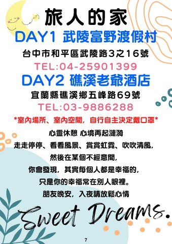 旅⼈的家 DAY1 武陵富野渡假村 台中市和平區武陵路3之16號 TEL:04-25901399 DAY2 礁溪⽼爺酒店 宜蘭縣礁溪鄉五峰路69號 TEL:03-9886288 *室內場所、 室內空間, ⾃⾏⾃主決定戴⼝罩* ⼼靈休憩 ⼼境再起漣漪 ⾛⾛停停、看看⾵景、賞賞虹霓、吹吹清⾵, 然後在某個不經意間, 你會發現,其實每個⼈都是幸福的, 只是你的幸福常在別⼈眼裡。 朋友晚安,⼊夜請放鬆⼼情 Sweet Dreams. 7