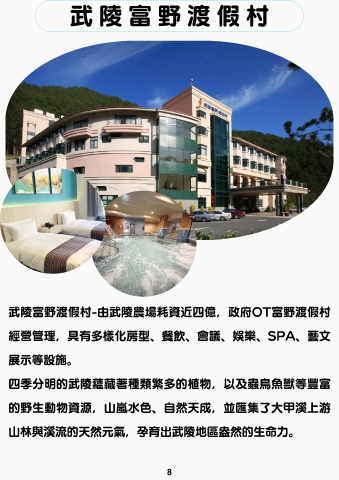 武 陵 富 野 渡 假 村 武陵富野渡假村-由武陵農場耗資近四億,政府OT富野渡假村 經營管理,具有多樣化房型、餐飲、會議、娛樂、SPA、藝⽂ 展⽰等設施。 四季分明的武陵蘊藏著種類繁多的植物,以及蟲⿃⿂獸等豐富 的野⽣動物資源,⼭嵐⽔⾊、⾃然天成,並匯集了⼤甲溪上游 ⼭林與溪流的天然元氣,孕育出武陵地區盎然的⽣命⼒。 8