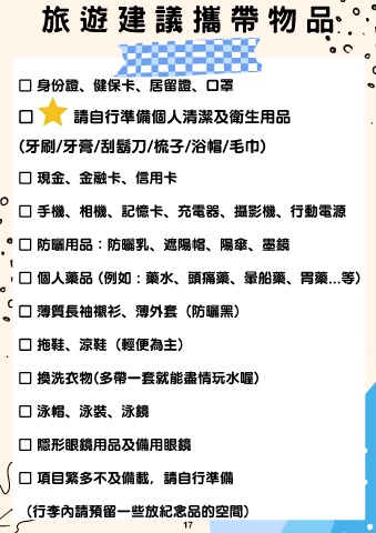 □ 防曬用品:防曬乳、遮陽帽、陽傘、墨鏡