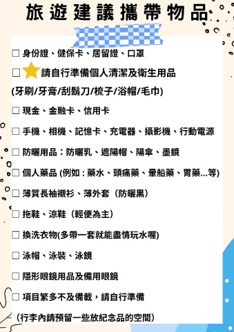 □ 換洗⾐物(多帶⼀套就能盡情玩⽔喔)