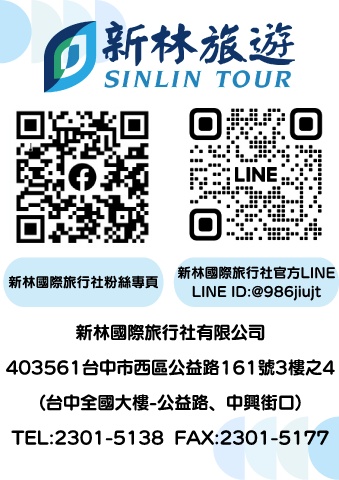 新林國際旅行社官方LINE 新林國際旅行社粉絲專頁 LINE ID:@986jiujt 新林國際旅行社有限公司 403561台中市西區公益路161號3樓之4 (台中全國大樓-公益路、中興街口) TEL:2301-5138 FAX:2301-5177
