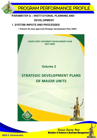 PARAMETER G – INSTITUTIONAL PLANNING AND DEVELOPMENT 1. SYSTEM–INPUTS AND PROCESSES ➢ Present the duly approved Strategic Development Plan (SDP). AREA X: Administration