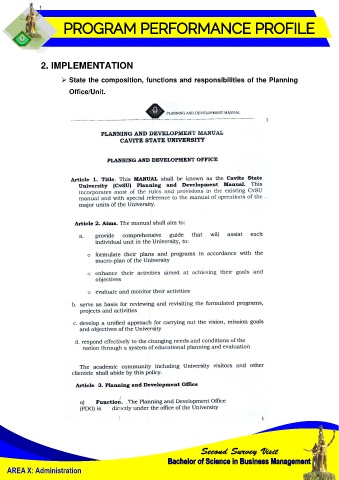 2. IMPLEMENTATION ➢ State the composition, functions and responsibilities of the Planning Office/Unit. AREA X: Administration
