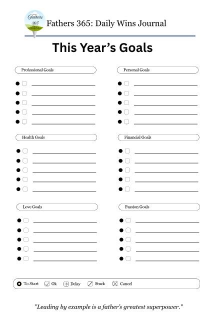 Fathers Fathers 365: Daily Wins Journal 365 This Year’s Goals Professional Goals Personal Goals Health Goals Financial Goals Love Goals Passion Goals To Start Ok Delay Stuck Cancel "Leading by example is a father’s greatest superpower."