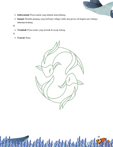 • Subterminal: Posisi mulut yang terletak dekat hidung. • Sungut: Rambut panjang yang berfungsi sebagai indra atau perasa (di kepala atau hidung) beberapa binatang T • Terminal: Posisi mulut yang terletak di ujung hidung. V • Ventral: Perut. 18