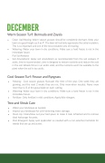 • Clean Up/Mowing: Warm season grasses should be completely dormant. Keep your lawn at a good height such as 4”. The lawn will certainly appreciate the extra insulation. This is so important and one of the most violated rules of mowing.