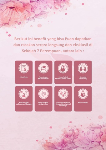 Berikut ini benefit yang bisa Puan dapatkan dan rasakan secara langsung dan eksklusif di Sekolah 7 Perempuan, antara lain :