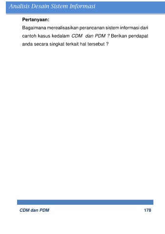 Pertanyaan: Bagaimana merealisasikan perancanan sistem informasi dari cantoh kasus kedalam CDM dan PDM ? Berikan pendapat anda secara singkat terkait hal tersebut ? CDM dan PDM 178