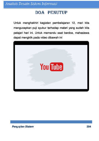 Doa penutup Untuk menghakhiri kegiatan pembelajaran 12, mari kita mengucapkan puji syukur terhadap materi yang sudah kita pelajari hari ini. Untuk memandu saat berdoa, mahasiswa dapat mengklik pada video dibawah ini Pengujian Sistem 204