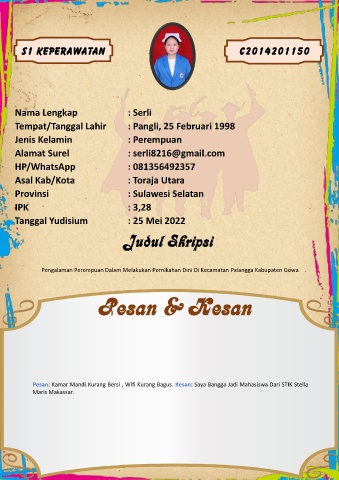 Pesan: Kamar Mandi Kurang Bersi , Wifi Kurang Bagus. Kesan: Saya Bangga Jadi Mahasiswa Dari STIK Stella