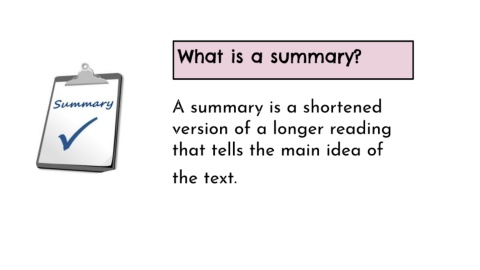 What is a summary? A summary is a shortened version of a longer reading that tells the main idea of the text.
