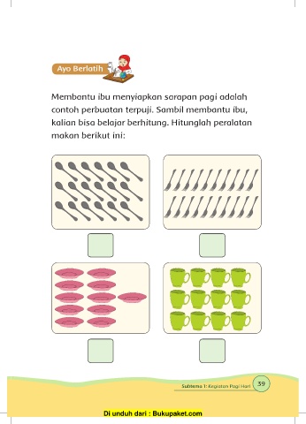 Membantu ibu menyiapkan sarapan pagi adalah contoh perbuatan terpuji. Sambil membantu ibu, kalian bisa belajar berhitung. Hitunglah peralatan makan berikut ini: 39 Subtema 1: Kegiatan Pagi Hari Di unduh dari : Bukupaket.com
