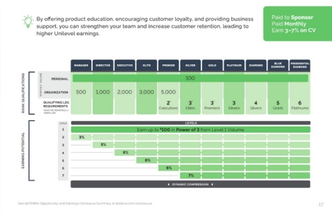 higher Unilevel earnings.                                               Earn 3–7% on CV