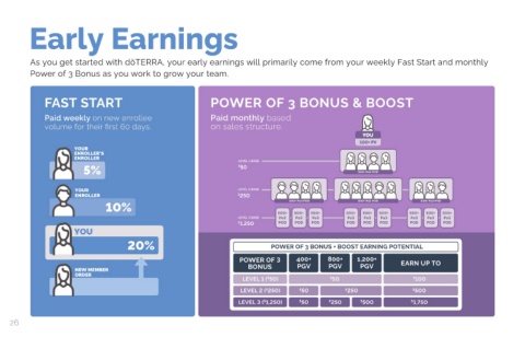 As you get started with dōTERRA, your early earnings will primarily come from your weekly Fast Start and monthly As you grow your team, build and retain your customer base, and find business partners, you qualify for additional