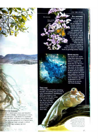 ON THE EDGE SEA DEFENSES In cool areas such ~ nonhern as Europe. there are no mangroves. Instead, shehered, muddy shores arc • olten bordered by salt marshes. Sall- ~ tolerani plants such as sea lavender grow over the marshes, which arc rich in wildlife . Salt marshes and mangroves both form vital sea defenses. helping to stop erosion and flooding . They