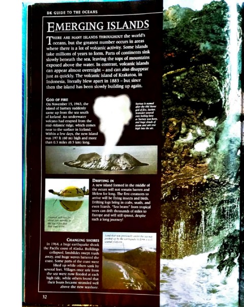 DK GUIDE TO THE OCEANS can appear almosl overnight - Indonesia, literally blew apan in 1883 - GOD OF FIRE On November 15, 1963. the island o! Sunscy suddenly cc1mc up from the sea south of Iceland. An underwater volcano had erupted from 1hc mid-A1lamic ridge, which comn nl·ar 10 tht.· surface in Jn.•land. Wi1hin a h. ·w days, the new island wa, 197 It (60 ml high and m