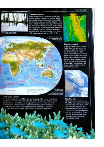 ONE OCEAN The R,·d Sea was lormed about 50 million years ago, when Africa ,tarted to drill away Imm Arabia. ,·ve111ually b,·camc the Red Sea. Th,· Red Sea is s1ill getting wider at a rate of about 0.8 in (2 cm) per year. In 150 million years.