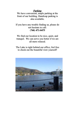 We have convenient, ample parking at the front of our building. Handicap parking is also available.