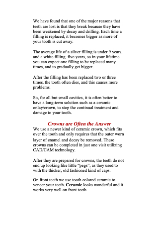 We have found that one of the major reasons that teeth are lost is that they break because they have been weakened by decay and drilling. Each time a filling is replaced, it becomes bigger as more of your tooth is cut away.