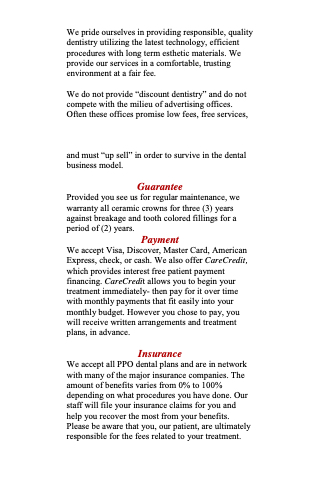 Provided you see us for regular maintenance, we warranty all ceramic crowns for three (3) years against breakage and tooth colored fillings for a period of (2) years.