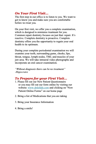 or you may fill out our form online by visiting our website: www.drdeldds.com and clicking on “New Patient Online Forms” on our home page