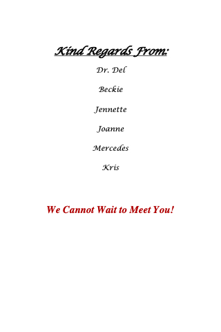 Kind Regards From: Dr. Del Beckie Jennette Joanne Mercedes Kris We Cannot Wait to Meet You!