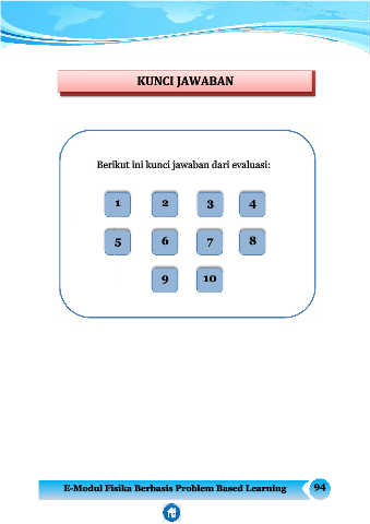 KUNCI JAWABAN Berikut ini kunci jawaban dari evaluasi: 1 2 3 4 5 6 7 8 9 10 E-Modul Fisika Berbasis Problem Based Learning 94