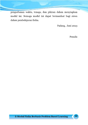 pengorbanan waktu, tenaga, dan pikiran dalam menyiapkan modul ini. Semoga modul ini dapat bermanfaat bagi siswa dalam pembelajaran fisika. Padang, Juni 2023 Penulis E-Modul Fisika Berbasis Problem Based Learning iii