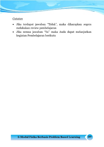 Catatan • Jika terdapat jawaban “Tidak”, maka diharapkan segera melakukan review pembelajaran • Jika semua jawaban “Ya” maka Anda dapat melanjutkan kegiatan Pembelajaran berikutn E-Modul Fisika Berbasis Problem Based Learning 50