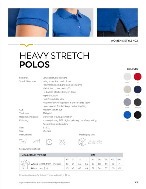 40° 5XL 3XL Dimensional tolerance for ½ chest +/- 1.5 cm and length +/- 2.0 cm