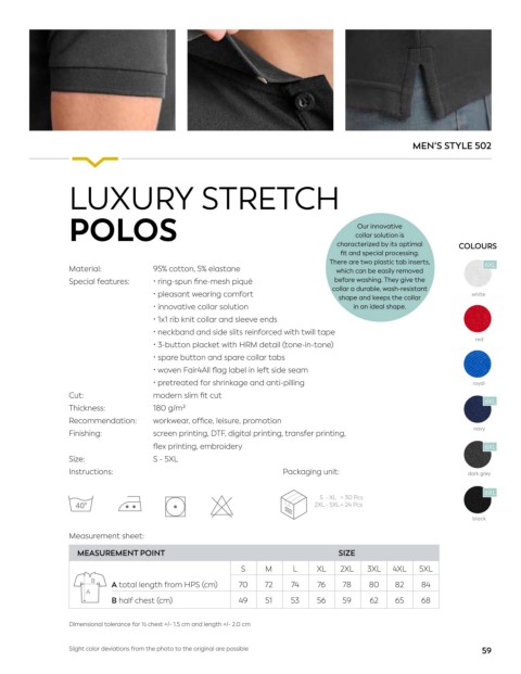 40°             Special features:   • ring-spun fine-mesh piqué               collar a durable, wash-resistant