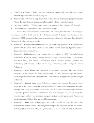 d. Matematika Yunani Kuno yaitu Pythagoras membuktikan teorema Pythagoras secara