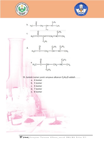 b. . c. . d. . e. . 10. Jumlah isomer posisi senyawa alkanon C 6H 12O adalah . . . . a. 4 isomer b. 5 isomer c. 6 isomer d. 7 isomer e. 8 isomer 97 |E-Modul_ S e e n y a w a T u r u n a n A l k a n a _ u n t u k S M A / M A K e l a s X I I