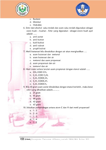 7. Metil butanoat bila direaksikan dengan air akan menghasilkan ….