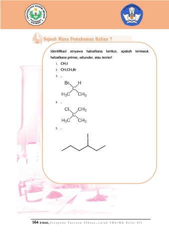 Identifikasi senyawa haloalkana berikut, apakah termasuk haloalkana primer, sekunder, atau tersier! 1. CH 3I 2. CH 3CH 2Br 3. . 4. . 5. . 164 |E-Modul_ S e e n y a w a T u r u n a n A l k a n a _ u n t u k S M A / M A K e l a s X I I