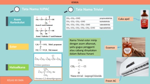 KIMIA Tata Nama IUPAC Tata Nama Trivial Asam Cuka apel Karboksilat Nama Trivial ester mirip dengan asam alkanoat, Ester yaitu gugus pengganti Essence atau cabang dinyatakan dalam Bahasa Yunani Haloalkana KELAS XII SMA Freon AC