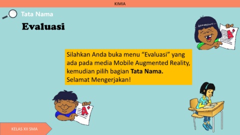KIMIA Tata Nama Evaluasi Silahkan Anda buka menu “Evaluasi” yang ada pada media Mobile Augmented Reality, kemudian pilih bagian Tata Nama. Selamat Mengerjakan! KELAS XII SMA