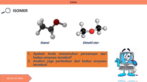 KIMIA ISOMER Play this Video! Struktur Ruang 1. Apakah Anda menemukan persamaan dari kedua senyawa tersebut? 2. Analisis juga perbedaan dari kedua senyawa tersebut! KELAS XII SMA