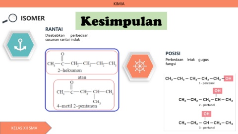 KIMIA ISOMER Kesimpulan RANTAI Disebabkan perbedaan susunan rantai induk POSISI Perbedaan letak gugus fungsi KELAS XII SMA