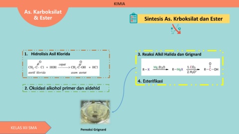 KIMIA As. Karboksilat & Ester Sintesis As. Krboksilat dan Ester 1. Hidrolisis Asil Klorida 3. Reaksi Alkil Halida dan Grignard 4. Esterifikasi 2. Oksidasi alkohol primer dan aldehid KELAS XII SMA Pereaksi Grignard