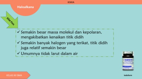KIMIA Haloalkana ✓ Semakin besar massa molekul dan kepolaran, mengakibatkan kenaikan titik didih ✓ Semakin banyak halogen yang terikat, titik didih juga relatif semakin besar ✓ Umumnya tidak larut dalam air KELAS XII SMA Iodoform