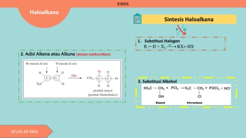 KIMIA Haloalkana Sintesis Haloalkana 1. Substitusi Halogen R ─ H + X 2 UV RX+ HX 2. Adisi Alkena atau Alkuna (aturan markovnikov) 3. Substitusi Alkohol KELAS XII SMA