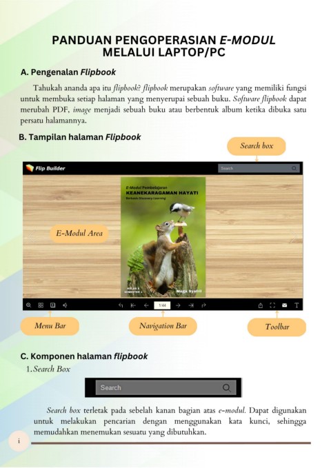 Search box terletak pada sebelah kanan bagian atas e-modul. Dapat digunakan