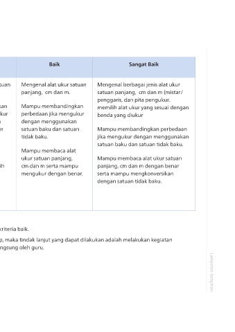 Perlu Bimbingan  Mengenal alat ukur   satuan panjang,  cm   dan m.  Belum mampu   membandingkan   perbedaan jika   mengukur dengan   menggunakan   satuan baku dan   satuan tidak baku.  Belum Mampu   membaca alat ukur   satuan panjang.         Peserta didik dikatakan mencapai tujuan pembelajaran jika mencapai kriteria baik. pengukuran kembali secara individu atau kelompok yang dibimbing langsung oleh guru. Jenis benda dan tingkat kesulitan dimulai