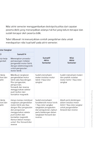 Sumatif Akhir Semester Sudah memahami materi instalasi motor listrik 1 fasa rotor sangkar Sudah memahami karakteristik motor listrik 1 fasa rotor sangkar rangkaian pengasutan dan penguncian, namun perlu bimbingan dalam rangkaian forward dan reverse.