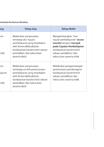 Tahap Berkembang Melakukan penyesuaian terhadap alur tujuan pembelajaran yang disediakan oleh Kemendikbudristek berdasarkan karakteristik satuan pendidikan Melakukan penyesuaian terhadap contoh perencanaan pembelajaran yang disediakan oleh Kemendikbudristek berdasarkan karakteristik satuan pendidikan