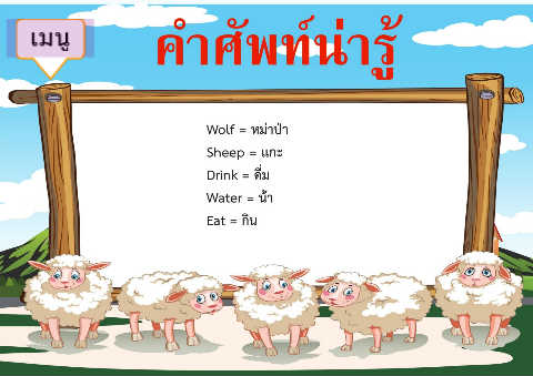Wolf = หม่าป่า Sheep = เเกะ Drink = ดื่ม Water = น้ำา Eat = กิน