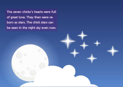 The seven chicks’s hearts were full of great love. They then were re- born as stars. The chick stars can be seen in the night sky even now.