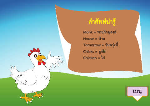 คำาศัพท์น่ารู้ Monk = พระภิกษุสงฆ์ House = บ้าน Tomorrow = วันพรุ่งนี้ Chicks = ลูกไก่ Chicken = ไก่