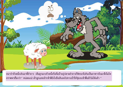 หมาป่าตัวหนึ่งเดินมาที่ลำาธาร เห็นลูกแกะตัวหนึ่งก้มดื่มน้ำาอยู่ปลายลำาธารก็คิดจะจับกินเป็นอาหารจึงแกล้งโมโห ตวาดหาเรื่องว่า“ หน่อยแน่! เจ้าลูกแกะเจ้ากล้าดียังไงถึงเดินลงไปกวนน้ำาให้ขุ่นจนข้าดื่มน้ำาไม่ได้แล้ว “